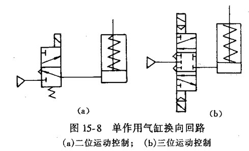 圖所示為由二位三通力士樂液壓泵電磁閥控制的換向回路,通電時,活塞桿伸出;斷電時,在彈簧力作用下活塞桿縮回。圖所示為由三位五通閥電-氣控制的換向回路,該閥具有自動對中功能,可使氣缸停在任意位置,但定位精度不高、定位時間不長。